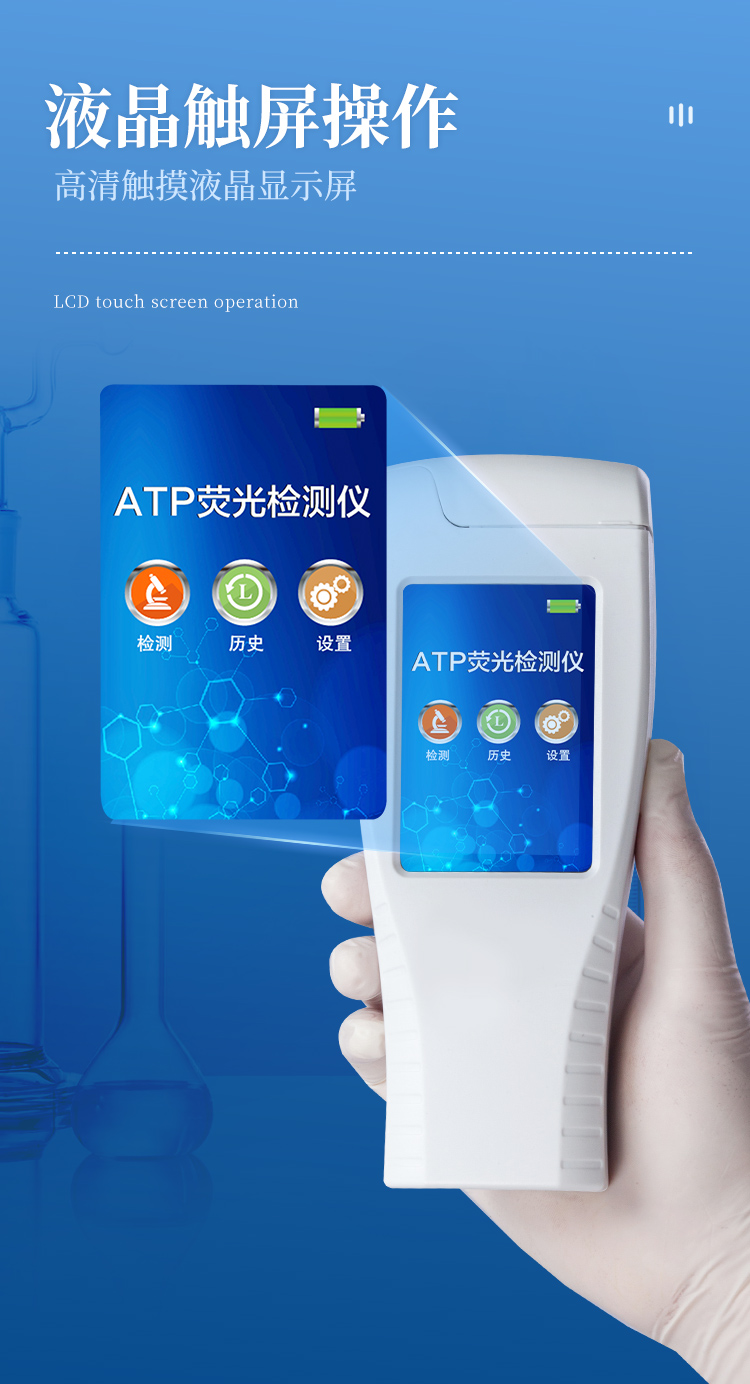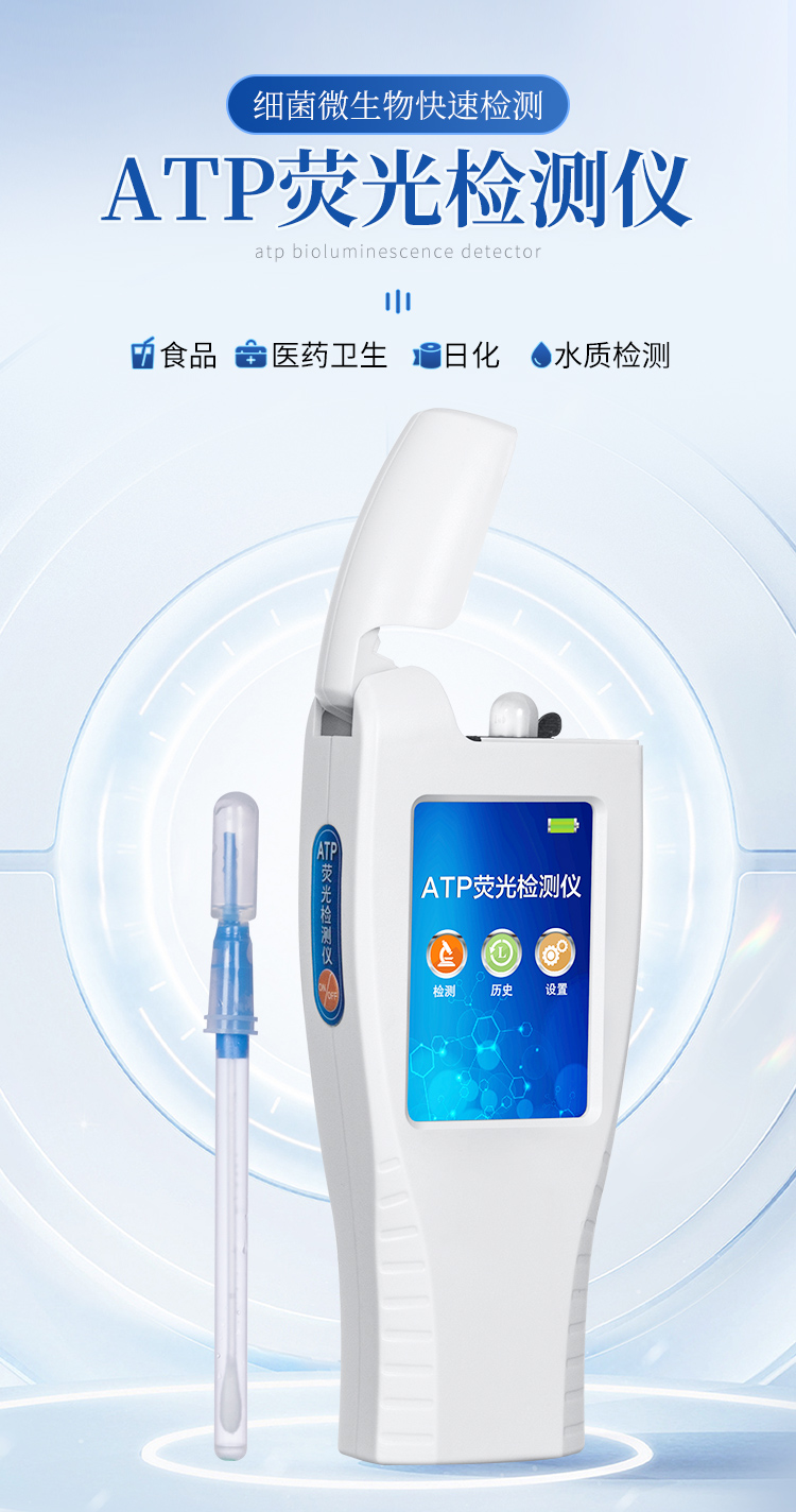 該設(shè)備采用生物化學(xué)反應(yīng)方法檢測(cè)ATP含量,ATP熒光檢測(cè)儀基于螢火蟲發(fā)光原理,利用“熒光素酶—熒光素體系”快速檢測(cè)三磷酸腺苷(ATP)。ATP拭子含有可以裂解細(xì)胞膜的試劑,能將細(xì)胞內(nèi)ATP釋放出來(lái),與試劑中含有的特異性酶發(fā)生反應(yīng),產(chǎn)生光,再用熒光照度計(jì)檢測(cè)發(fā)光值,微生物的數(shù)量與發(fā)光值成正比,由于所有生物活細(xì)胞中含有恒量的ATP,所以ATP含量可以清晰地表明樣品中微生物與其他生物殘余的多少,用于判斷衛(wèi)生狀況。