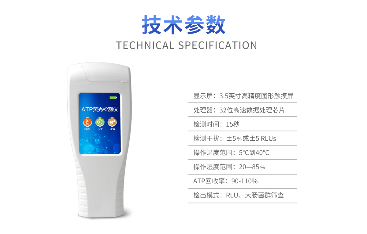 該設(shè)備采用生物化學反應(yīng)方法檢測ATP含量,潔凈度檢測儀基于螢火蟲發(fā)光原理,利用“熒光素酶—熒光素體系”快速檢測三磷酸腺苷(ATP)。ATP拭子含有可以裂解細胞膜的試劑,能將細胞內(nèi)ATP釋放出來,與試劑中含有的特異性酶發(fā)生反應(yīng),產(chǎn)生光,再用熒光照度計檢測發(fā)光值,微生物的數(shù)量與發(fā)光值成正比,由于所有生物活細胞中含有恒量的ATP,所以ATP含量可以清晰地表明樣品中微生物與其他生物殘余的多少,用于判斷衛(wèi)生狀況。