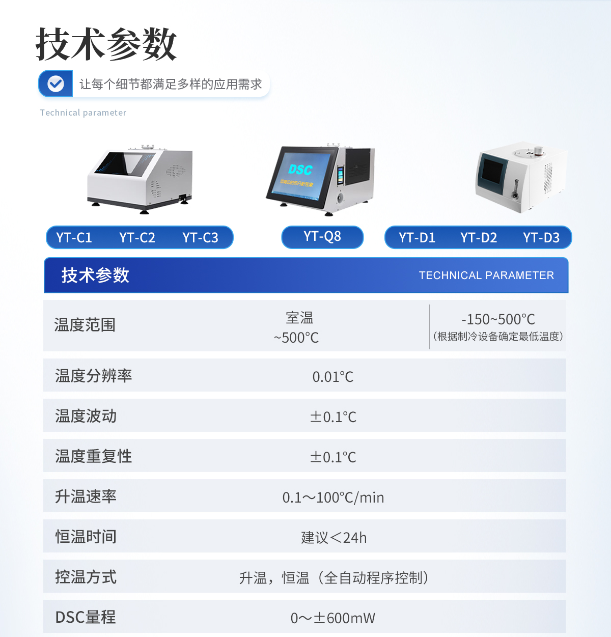 1.溫度范圍: -150~500℃ (根據(jù)制冷設(shè)備確定**溫度) 2.溫度分辨率: 0.01℃ 3.溫度波動: ±0.1℃ 4.溫度重復(fù)性: ±0.1℃ 5.升溫速率: 0.1~100℃/min 6.恒溫時(shí)間:建議<24h 7.控溫方式:升溫,恒溫(全自動程序控制) 8.DSC量程: 0~±600mW 9.DSC解析度: 0.01mW 10.DSC靈敏度: 0.01mW 11.工作電源: AC220V/50Hz或定制 12.可選冷卻設(shè)備: - 壓縮空氣冷卻(-AR):RT ... 500℃ - 機(jī)械制冷(-MR): -40 ... 500℃ - 液氮制冷(-LN):-150 ... 500℃ (可以單獨(dú)或同時(shí)連接多種冷卻裝置) 13. 氣氛控制氣體:氮?dú)?、氧氣(儀器自動切換) 14.氣體流量:0-300mL/min 15.氣體壓力:0.2MPa 16.顯示方式: 24bit色,8寸 LCD觸摸屏顯示 17.數(shù)據(jù)接口:標(biāo)準(zhǔn)USB接口 18.參數(shù)標(biāo)準(zhǔn): 配有標(biāo)準(zhǔn)物質(zhì)(銦,錫,鋅),用戶可自行校正溫度