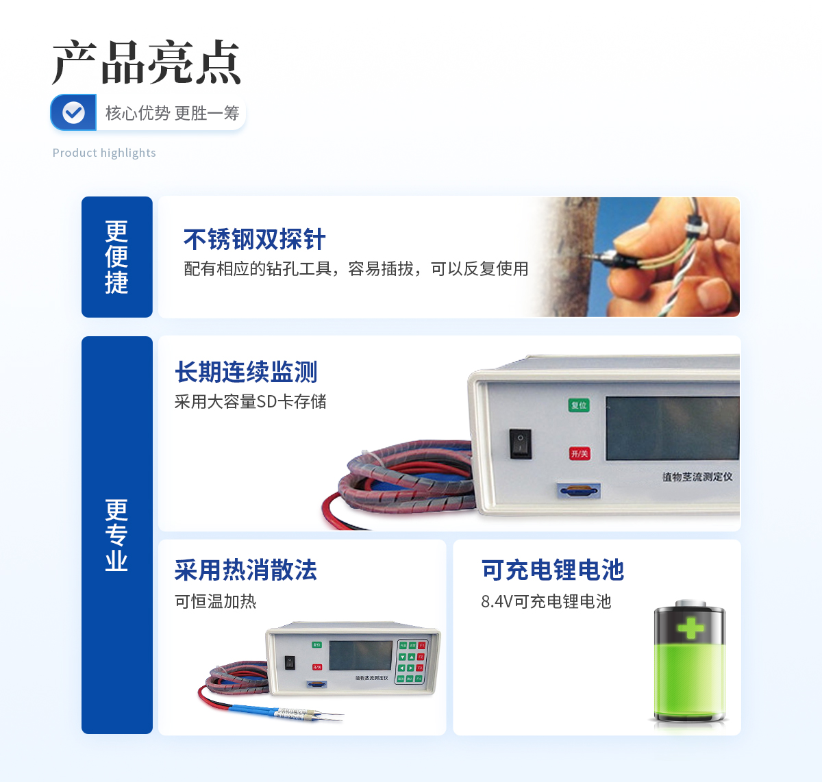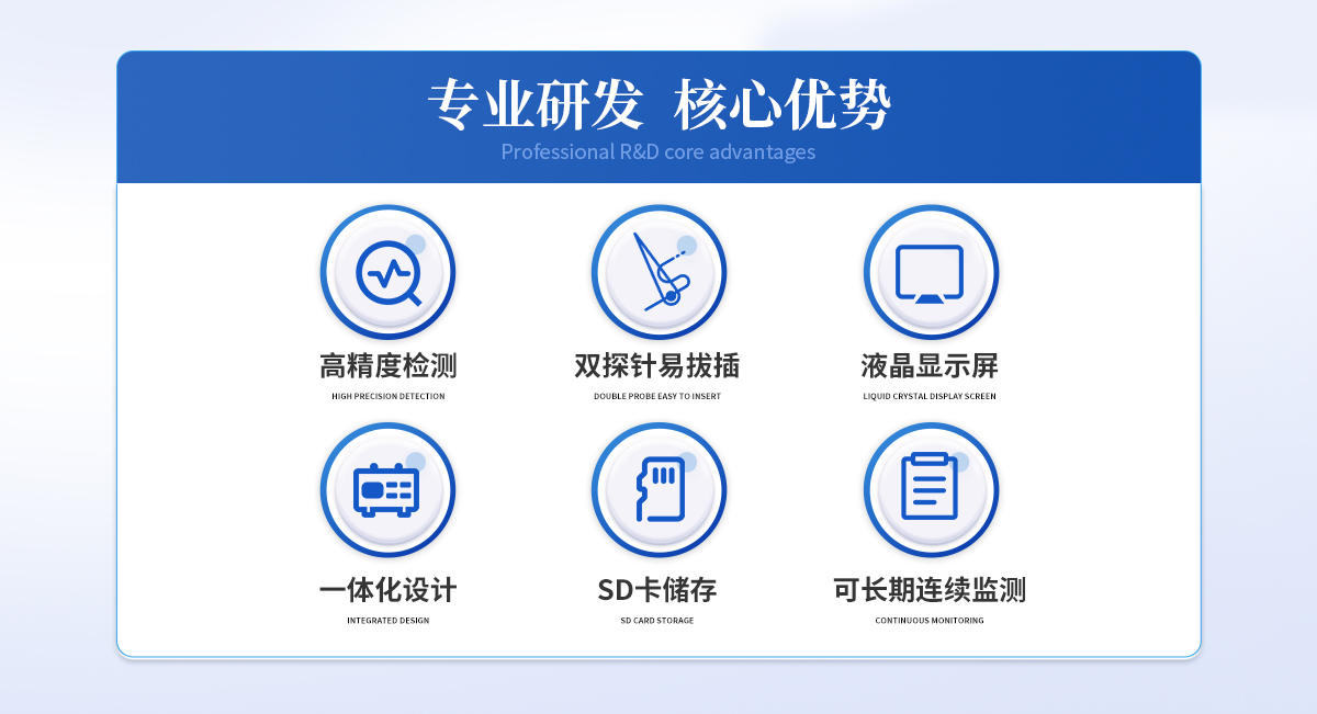 | 雙探針,配有相應的鉆孔工具,容易插拔,可以反復使用 | 采用熱消散法,可恒溫加熱 | 可以長期連續(xù)監(jiān)測 | 不銹鋼探針,采用Teflon涂層,持久耐用 | 采用高精度T型熱電偶直接與數(shù)據分析儀連接 | 采用大容量SD卡存儲 |