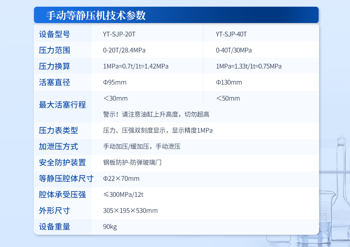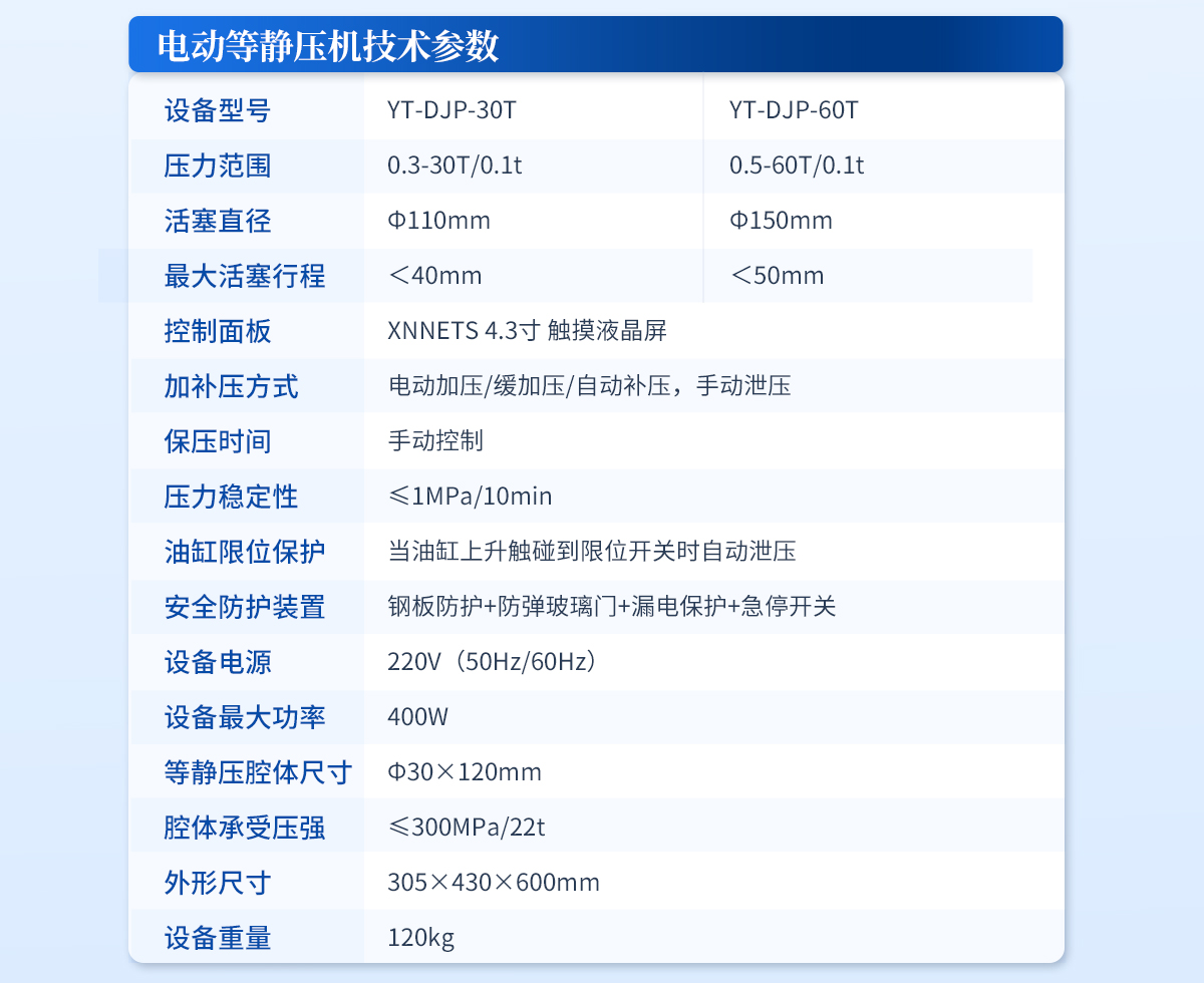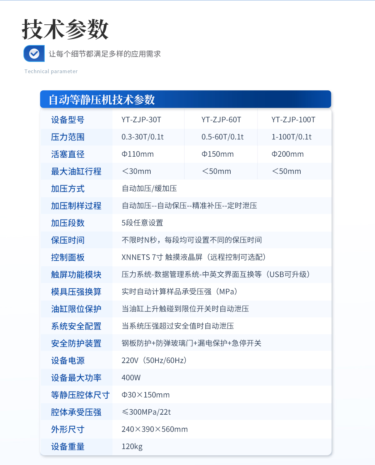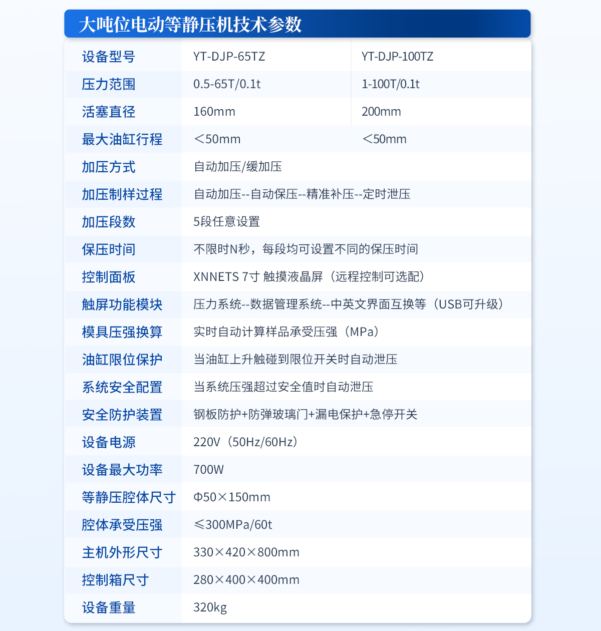 | 規(guī)格型號:YT-ZJP-100T | 壓力范圍:1-100T/0.1t | 活塞直徑 :Φ200mm | **油缸行程:<50mm | 加壓方式:自動加壓/緩加壓 | 加壓制樣過程:自動加壓--自動保壓--精準補壓--定時泄壓 | 加壓段數(shù):5段任意設置 | 保壓時間 :不限時N秒,每段均可設置不同的保壓時間 | 控制面板:XNNETS 7寸 觸摸液晶屏(遠程控制可選配) | 觸屏功能模塊: 壓力系-統(tǒng)-數(shù)據(jù)管理系統(tǒng)--中英文界面互換等(USB可升級) | 模具壓強換算:實時自動計算樣品承受壓強(MPa) | 油缸限位保護:當油缸上升觸碰到限位開關時自動泄壓 | 系統(tǒng)安全配置 :當系統(tǒng)壓強超過安全值時自動泄壓 | 安全防護裝置:鋼板防護+防彈玻璃門+漏電保護+急停開關 | 設備電源:220V(50Hz/60Hz) | 設備**功率:400W | 等靜壓腔體尺寸:Φ60×150mm | 腔體承受壓強: ≤300MPa/87t | 外形尺寸:330×580×720mm | 設備重量:290kg | 配置說明:等靜壓機1臺!可根據(jù)需求定制500MPa等靜壓機或橡膠模具 |