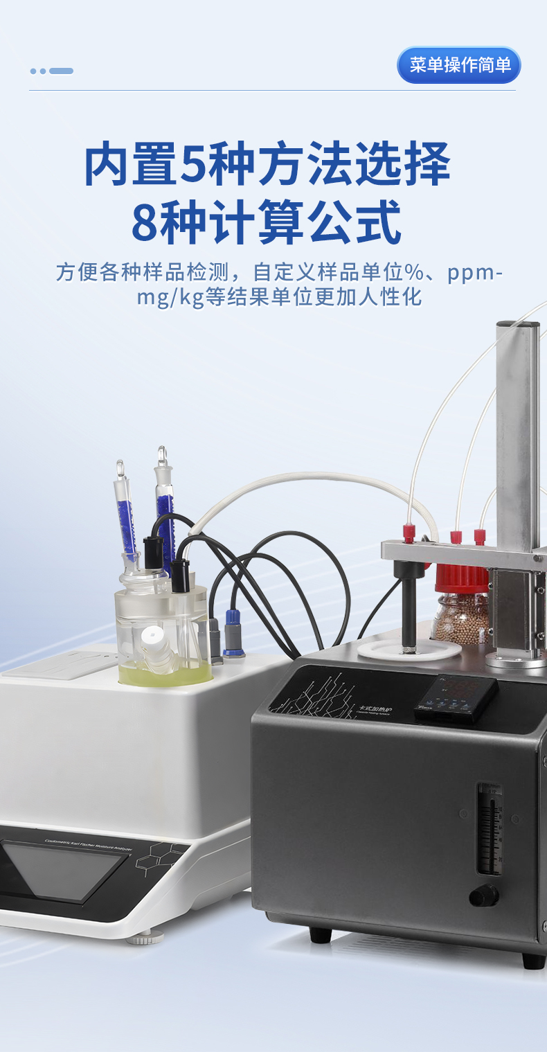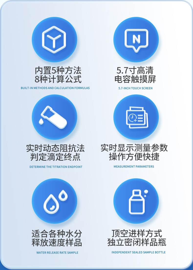 | 1. 采用高精度庫侖法水分測(cè)定儀與卡氏加熱爐聯(lián)用,**可以檢測(cè)到3μg水,精度達(dá)到ppm級(jí); | 2. 空芯氣針進(jìn)樣,和帶加熱功能的氣體輸送管路,零死體積水汽不凝結(jié),操作更簡(jiǎn)單,同時(shí)也很大的提高了儀器的準(zhǔn)確性和重復(fù)性; | 3. 5.7寸高清電容觸摸屏,實(shí)時(shí)顯示測(cè)量參數(shù),簡(jiǎn)潔明了的功能菜單,全面的參數(shù)顯示,操作方便快捷 ; | 4. 內(nèi)置5種方法可供選擇,8種計(jì)算公式方便各種樣品檢測(cè),自定義樣品單位%、ppm、mg/kg等結(jié)果單位更加人性化; | 5. 系統(tǒng)實(shí)時(shí)檢測(cè)環(huán)境中的水分,精準(zhǔn)扣除漂移,采用實(shí)時(shí)動(dòng)態(tài)阻抗法判定滴定終點(diǎn),測(cè)量結(jié)果更精準(zhǔn); | 6. **溫度300℃可以滿足大部分樣品檢測(cè),氣流0-100ml可調(diào),適合各種水分釋放速度的樣品; | 7. 操作方便,用戶只需要設(shè)置合適的溫度,合適的流量,把樣品放入事先準(zhǔn)備好的樣品瓶,放入加熱器,然后把傳輸針扎入樣品瓶的硅膠墊,在儀器上點(diǎn)開始測(cè)量即可; | 8. 無需等待上一次樣品瓶冷卻之后才能進(jìn)行下一次樣品測(cè)量,更換樣品瓶過程中樣品瓶始終保持密封狀態(tài),測(cè)量效率更高更準(zhǔn)確,尤其是吸濕性強(qiáng)的樣品無需擔(dān)心空氣中水分的干擾; | 9. 采用頂空進(jìn)樣的方式,保證每個(gè)測(cè)定采用“新”的樣品瓶,樣品測(cè)定無交叉感染。樣品瓶體積小,確保較小的死體積和背景水分值。獨(dú)立密閉樣品瓶,測(cè)定時(shí)無需樣品轉(zhuǎn)移,結(jié)果更準(zhǔn)確; | 10. 旋蓋式樣品瓶,無需專用且昂貴的壓蓋器和開蓋器,使用非常方便; | 11. 頂空進(jìn)樣技術(shù),只有氣體進(jìn)入水分測(cè)定儀反應(yīng)杯,不污染反應(yīng)杯及電解電極。 |
