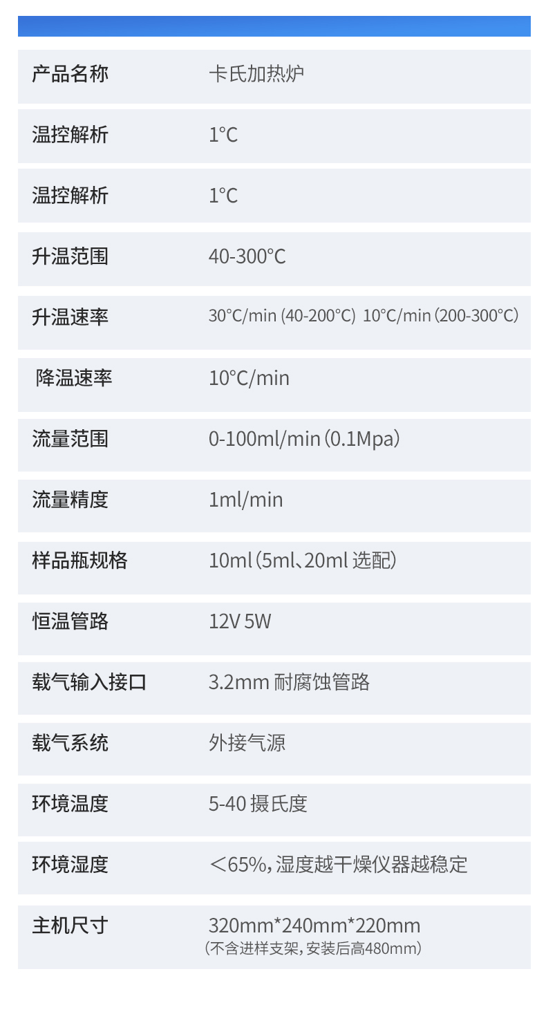 | 1. 測(cè)定原理:卡爾費(fèi)休庫倫法(電量法) | 2. 測(cè)量速度:2.8mgH 2 O/min(**) | 3. 測(cè)量范圍:3μg-300mg(典型值) | 4. 測(cè)量準(zhǔn)確度:3μg(10ug--100μg H2O) ≤0.3%(水含量>100μg H2O)(不含進(jìn)樣量誤差) | 5. 測(cè)量準(zhǔn)確度:3μg(10ug--100μg H2O) ≤0.3%(水含量>100μg H2O)(不含進(jìn)樣量誤差) | 6. 測(cè)量分辨力:0.1μg H 2 O | 7. 相對(duì)含水量范圍:1ppm-100% | 8. 電解電流:0-500mA 可調(diào)節(jié) | 9. 水分濃度分辨率:0.001ppm | 10. 濃度單位:%、ppm、mg/kg | 11. 攪拌速度:無級(jí)觸摸調(diào)節(jié) | 12. 漂移值空白值扣除:自動(dòng)扣除 | 13. 特殊功能:自動(dòng)漂移補(bǔ)償、環(huán)境及本底水分自動(dòng)扣除、故障自檢提示 | 14. 顯示及操作:彩色觸摸屏 | 15. 樣品編號(hào):用戶可自由設(shè)定樣品編號(hào) | 16. 存儲(chǔ)數(shù)據(jù):500條 | 17. 打印功能:內(nèi)置低能耗高速熱敏打印機(jī),58毫米紙寬 | 18. 打印內(nèi)容:根據(jù)用戶測(cè)量公式及測(cè)量結(jié)果顯示不同內(nèi)容 | 19. 日歷/時(shí)間:當(dāng)前時(shí)間、日期、檢測(cè)時(shí)間日期顯示并打印輸出 | 20. 終點(diǎn)指示:屏幕提示 / 打印輸出 / 聲音警告 / 終點(diǎn)燈指示 | 21. 使用環(huán)境:溫度 2℃-50℃,濕度?90% | 22. 功率消耗:≤50W | 23. 主機(jī)尺寸:320*220*190mm | 24. 電源電壓:220V 50HZ 150W | 25. 重量:主機(jī)凈重 4kg 包裝后 8KG | 26. 產(chǎn)品名稱:卡氏加熱爐 | 27. 溫控解析:1℃ | 28. 溫控解析:1℃ | 29. 升溫范圍:40-300℃ | 30. 升溫速率:30℃/min (40-200℃) 10℃/min(200-300℃) | 31. 降溫速率:10℃/min | 32. 流量范圍:0-100ml/min(0.1Mpa) | 33. 流量精度:1ml/min | 34. 樣品瓶規(guī)格:10ml(5ml、20ml 選配) | 35. 恒溫管路:12V 5W | 36. 載氣輸入接口:3.2mm 耐腐蝕管路 | 37. 載氣系統(tǒng):外接氣源 | 38. 環(huán)境溫度:5-40 攝氏度 | 39. 環(huán)境濕度:<65%,濕度越干燥儀器越穩(wěn)定 | 40. 主機(jī)尺寸:320mm*240mm*220mm(不含進(jìn)樣支架,安裝后高480mm) |