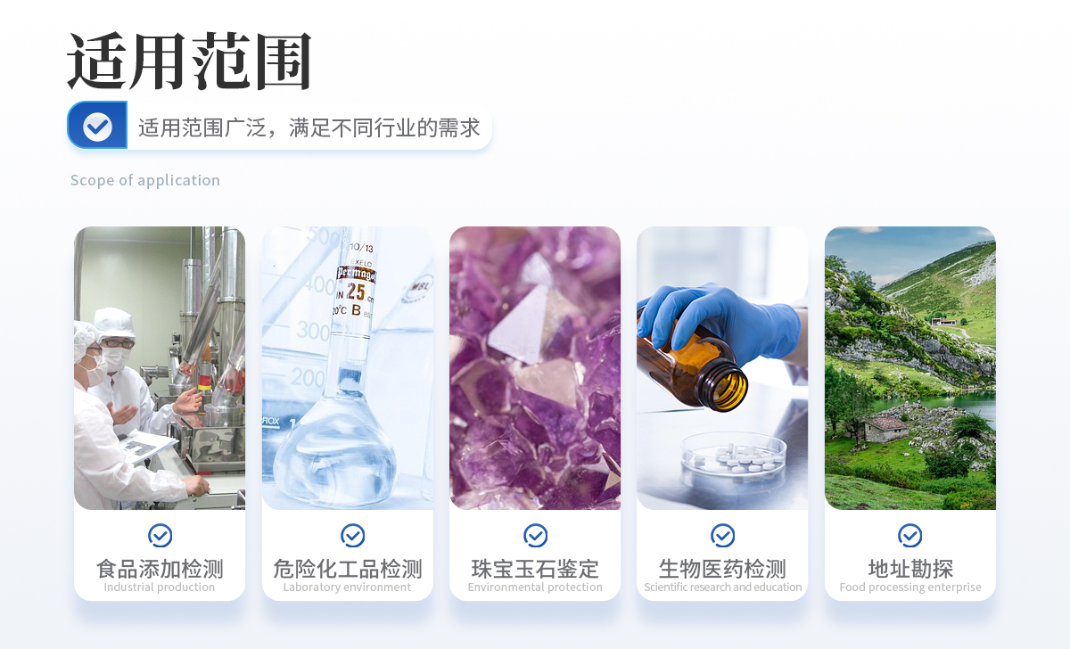 食品違禁添加物、色素添加、農(nóng)獸藥殘留檢測(cè) 爆炸物、危險(xiǎn)化工品、易燃易爆品檢測(cè) 珠寶玉石鑒定、文物鑒別 生物醫(yī)藥檢測(cè)、材料表征、地址勘探等 其他各類訂制應(yīng)用