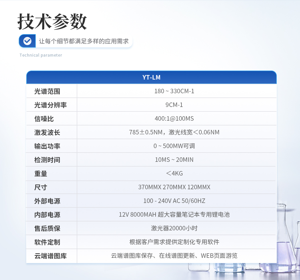 規(guī)格:YT-LM標(biāo)準(zhǔn)版 光譜范圍:180 ~ 3300cm-1 光譜分辨率:9cm-1 信噪比:400:1@100ms 激發(fā)波長(zhǎng):785+0.5nm,激光線寬< 0.06 nm 輸出功率:0~ 500mW可調(diào) 檢測(cè)時(shí)間:10ms ~ 20min 重量:<4kg 尺寸:370mmx 270mmx 120mm 外部電源:100-240V AC 50/60Hz 內(nèi)部電源:12V 8000mAH 超大容量筆記本專用鋰電池 售后質(zhì)保:激光器20000小時(shí) 軟件定制:根據(jù)客戶需求提供定制化專用軟件 云端譜圖庫(kù):支持云端譜圖保存、 在線譜圖更新、WEB 頁(yè)面瀏覽