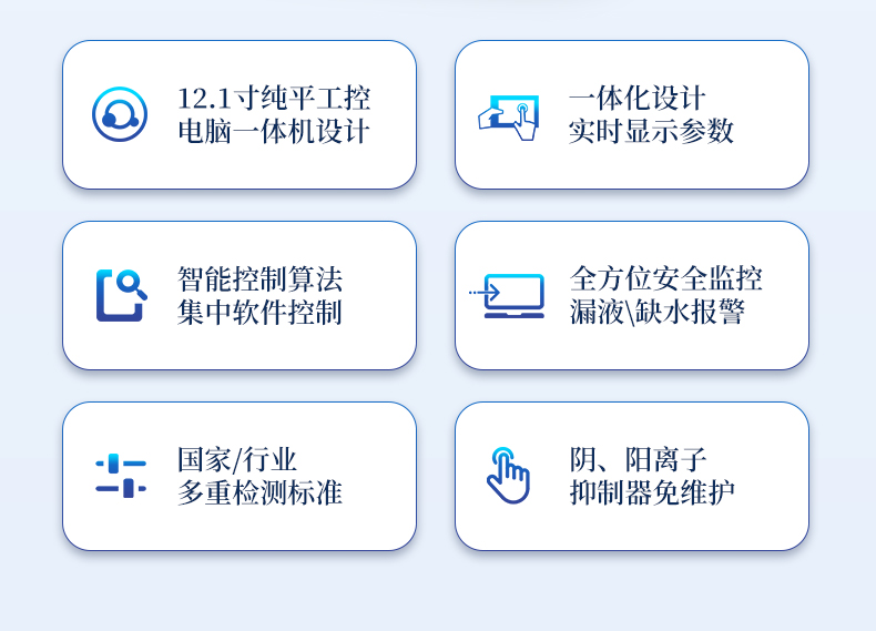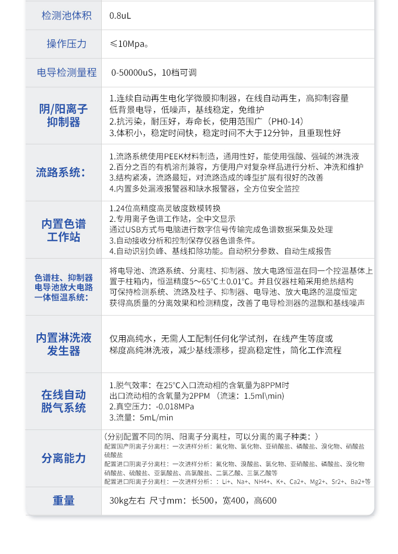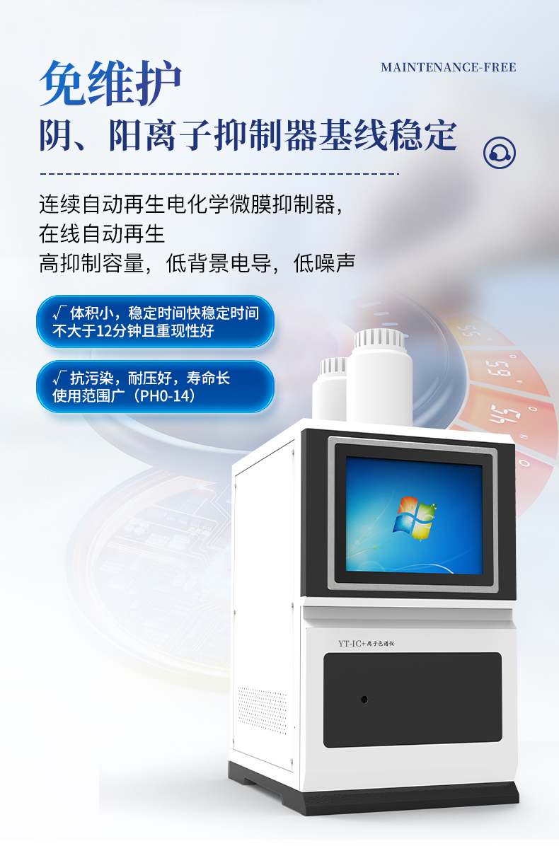 | 我們公司作為離子色譜儀器市場的新業(yè)態(tài),一直致力于為用戶提供更快捷、優(yōu)質(zhì)的儀器,以保障實驗室的建設(shè)和運行。始終堅持以客戶為中心,為有檢測需求的客戶服務(wù)。物美價廉、響應(yīng)迅捷、服務(wù)全面。 | 全新一代離子色譜儀,采用12.1吋純平工控電腦一體機設(shè)計(用戶不需要配電腦),實時顯示儀器運行參數(shù)和狀態(tài);一鍵啟動電動閥進樣,一鍵完成儀器開關(guān)機、維護等操作,一鍵調(diào)閱儀器操作教程,方便快捷。 | 離子色譜儀核心零部件自主研發(fā)、自主知識產(chǎn)權(quán)可控。采用一體化設(shè)計,集離子色譜主機、淋洗液發(fā)生器、工控電腦、色譜工作站于一體,結(jié)構(gòu)緊湊,流路*短,對流路造成的峰型擴展有很好的改善。一體化恒溫箱:色譜柱、抑制器、電導(dǎo)池、放大電路都處于同一恒溫系統(tǒng),改善了電導(dǎo)檢測器的溫飄和基線噪聲。內(nèi)置多處漏液報警器和缺水報警器,全方位安全監(jiān)控。由PLC控制的各個部件統(tǒng)一到電腦顯示屏的集中軟件控制系統(tǒng),操作方便,鼠標(biāo)所見即所控。 |