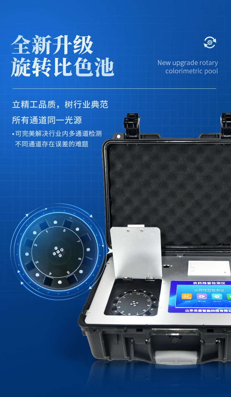 | 機器采用全新安卓智能系統(tǒng),主控芯片采用 ARM Cortex-A7,RK3288/4核處理器,主頻1.88Ghz,運轉(zhuǎn)速度更快速,穩(wěn)定性更強。 | 創(chuàng)新檢測模式: *儀器采用精密旋轉(zhuǎn)比色池設(shè)計,使用光源一致,可以解決各通道間由于光源誤差帶來的檢測結(jié)果誤差問題,檢測結(jié)果更加精準(zhǔn)。 *儀器具有自動識別比色皿檢測功能,即:將樣品比色皿放入儀器后,點擊樣品檢測,儀器自動識別比色皿進行通道檢測。 | 供電方式:交直流兩用,直流 12V 供電,可連接車載電源,可配 6ah 大容量充電鋰電池,方便戶外流動測試。 | 顯示方式:7英寸液晶觸摸屏顯示,人性化中文操作界面,讀數(shù)直觀、簡單。 | 檢測通道:12個檢測通道,可以同時測試多個樣品,循環(huán)檢測,即放即檢,每個樣品由程序控制分別獨立工作,不會互相干擾。 | 高精光源系統(tǒng): ①儀器光源采用進口超高亮發(fā)光二極管,光源亮度可以自動調(diào)節(jié)與校準(zhǔn) ②智能恒流穩(wěn)壓,光強自動校準(zhǔn),長時間連續(xù)工作光源無溫漂現(xiàn)象。 | 智能操作分析系統(tǒng): ①儀器具有100多種蔬菜名稱菜單庫,分類管理,并可按需添加或刪除、編輯蔬菜名稱;可在同一檢測界面自動對應(yīng)相關(guān)檢測通道一次性選擇1-24個樣品名稱,無需退出界面,節(jié)省操作時間。 ②內(nèi)置新國家限量標(biāo)準(zhǔn),與所測結(jié)果進行現(xiàn)場比對,并持續(xù)更新標(biāo)準(zhǔn)。 | 完善的配套硬件: ①采用串口5v打印機,可選擇手動打印或者自動打印,三分鐘出打印結(jié)果,打印格式為檢測人姓名、吸光度差值、檢測時間、檢測機構(gòu)、樣品名稱及結(jié)果判定。 ②儀器具有無線上傳模塊,檢測結(jié)果可批量打印,批量上傳。 | 數(shù)據(jù)調(diào)用: ①儀器可存儲20萬條檢測結(jié)果, ②檢測結(jié)果為Excel表格,方便后期進行數(shù)據(jù)分析與匯總報告 ③儀器采用USB2.0接口設(shè)計,支持 U 盤存儲,方便數(shù)據(jù)的存貯和移動,并可隨時與計算機直接相連,實現(xiàn)數(shù)據(jù)查詢、瀏覽、分析、統(tǒng)計、打印等。 | 后期產(chǎn)品固件可升級。 | 安全證書,放心保障:儀器具有中國計量科學(xué)研究院校準(zhǔn)證書,權(quán)威認(rèn)證,使用放心。 | 機箱采用工業(yè)級ABS工程塑料箱,方便攜帶,穩(wěn)固耐用,便于流動測試。 |