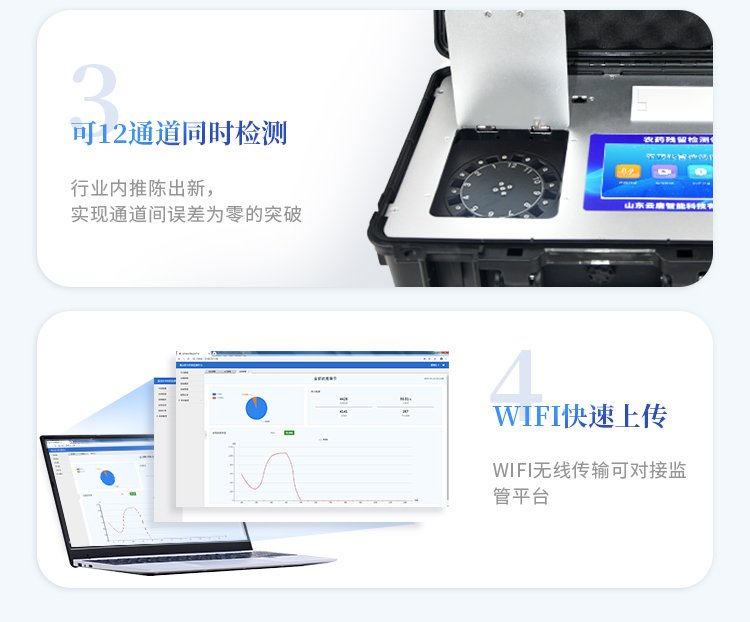 | 安卓智能操作系統(tǒng),采用更加**和人性化操作,儀器具有無線聯(lián)網(wǎng)上傳功能,快速上傳數(shù)據(jù),進行數(shù)據(jù)統(tǒng)計和分析。 | 智能化程度高,儀器具有自檢功能:具有開機自檢和調(diào)零功能,具有自動檢測重復(fù)性功能;同時,檢測完成可自動打印檢測報告和二維碼。手機掃碼可顯示出詳細(xì)檢測信息。 | 儀器帶有監(jiān)管平臺,數(shù)據(jù)可局域網(wǎng)和互聯(lián)網(wǎng)數(shù)據(jù)上傳,檢測結(jié)果直接傳至食品安全監(jiān)管平臺。進行區(qū)域食品安全監(jiān)管及大數(shù)據(jù)分析處理與數(shù)據(jù)統(tǒng)計,檢測區(qū)域食品安全長短期動態(tài),達(dá)到食品安全問題預(yù)估、預(yù)警 。 | 樣品處理簡單省力,整體操作快速、安全、便捷。 | 儀器具有自身保護功能,可設(shè)置用戶名及密碼,防止非工作人員操作等。 | 內(nèi)置強大的數(shù)據(jù)庫,可在儀器上直接選擇樣品名稱、檢測指標(biāo)、送檢單位等信息,也可在儀器上直接編輯錄入樣品名稱、檢測指標(biāo)、送檢單位等信息并保存進樣品數(shù)據(jù)庫,方便后期操作調(diào)取使用。 | 儀器具有重新校準(zhǔn)、鎖定、恢復(fù)出廠設(shè)置功能。 |