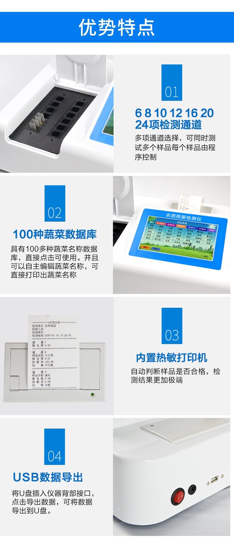 | 乙酰膽堿酯酶和丁酰膽堿酯酶試劑均可以使用,符合國家標(biāo)準(zhǔn)和農(nóng)業(yè)部標(biāo)準(zhǔn)的要求。 | 自動判斷樣品是否合格,檢測結(jié)果更加直觀。 | 儀器具有100多種蔬菜名稱菜單庫,分類管理,并可按需添加或刪除蔬菜名,編輯蔬菜名稱,可直接打印出蔬菜名稱。 | 檢測通道:10個檢測通道,可以同時測試多個樣品,循環(huán)檢測,即放即檢,每個樣品由程序控制分別獨立工作,不會互相干擾。 | 智能操作系統(tǒng),采用更加人性化操作,主控采用多核處理器,主頻1.88Ghz,運轉(zhuǎn)速度更快速,穩(wěn)定性更強(qiáng)。 | 顯示方式:7英寸高靈敏真彩觸摸屏顯示,人性化中文操作界面,讀數(shù)直觀、簡單。 | 打印機(jī)采用串口5v打印,可選擇手動打印或者自動打印,三分鐘出打印結(jié)果,打印格式為檢測人姓名、吸光度差值、檢測時間、檢測機(jī)構(gòu)、樣品名稱及結(jié)果判定。 | 光源采用進(jìn)口超高亮發(fā)光二極管,具有低功耗、高精度、穩(wěn)定性強(qiáng)、光源可控可以關(guān)掉不使用的光源,響應(yīng)速度快等優(yōu)點。 | 智能恒流穩(wěn)壓,光強(qiáng)自動校準(zhǔn),長時間連續(xù)工作光源無溫漂現(xiàn)象。 | 儀器具有GPRS遠(yuǎn)傳功能,可插手機(jī)卡實現(xiàn)數(shù)據(jù)遠(yuǎn)傳平臺,wifi聯(lián)網(wǎng)功能,可將數(shù)據(jù)快速上傳電腦,進(jìn)行數(shù)據(jù)管理與統(tǒng)計。 | 采用USB2.0接口設(shè)計,方便數(shù)據(jù)的存貯和移動,并可隨時與計算機(jī)直接相連,并且可用計算機(jī)控制儀器。實現(xiàn)數(shù)據(jù)查詢、瀏覽、分析、統(tǒng)計、打印等。 | 智能化程度高,儀器具有自檢功能:具有開機(jī)自檢和調(diào)零功能,具有自動檢測重復(fù)性功能 | 儀器具有自身保護(hù)功能,可設(shè)置用戶名及密碼,防止非工作人員操作等。 | 采用DC12v直流供電,安全系統(tǒng)更高,并且配備6A鋰電池充電器。 | 儀器具有重新校準(zhǔn)、鎖定、恢復(fù)出廠設(shè)置功能。 |