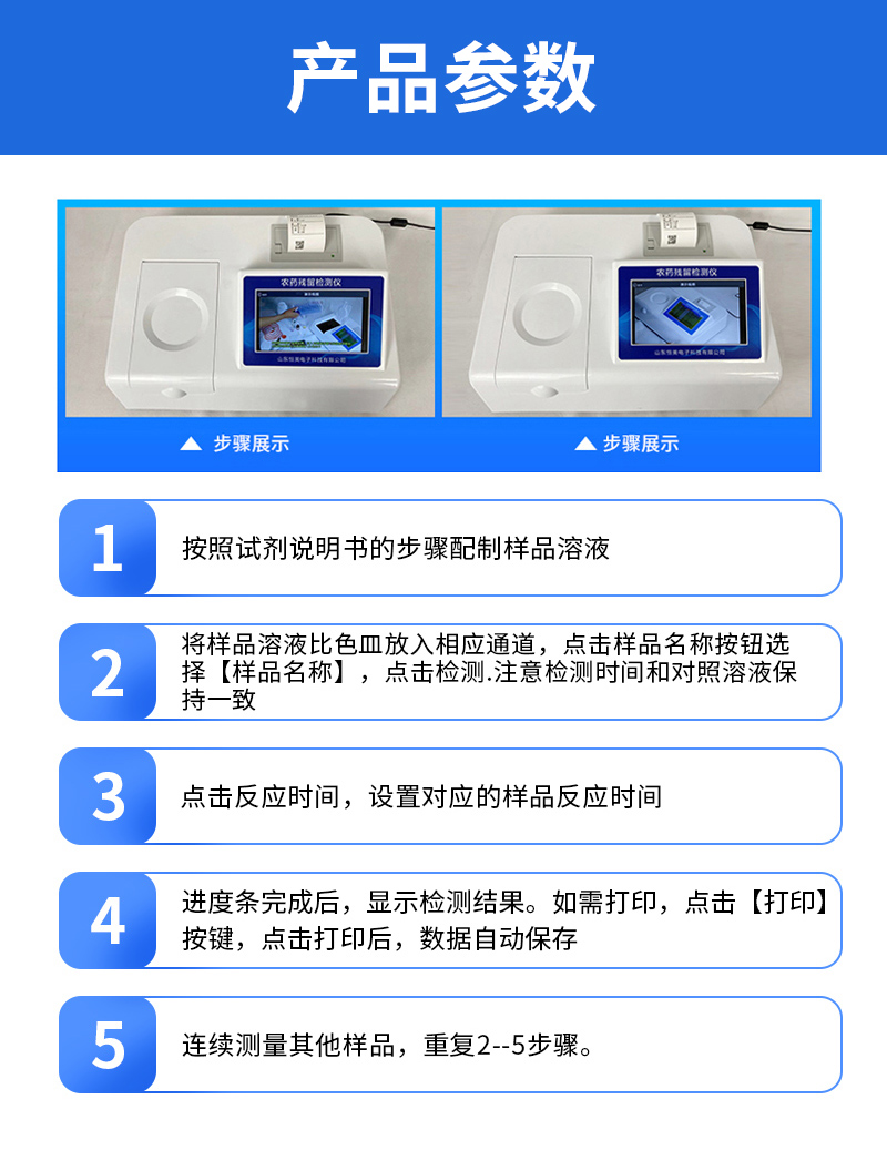 | 乙酰膽堿酯酶和丁酰膽堿酯酶試劑均可以使用,符合國(guó)家標(biāo)準(zhǔn)和農(nóng)業(yè)部標(biāo)準(zhǔn)的要求。 | 自動(dòng)判斷樣品是否合格,檢測(cè)結(jié)果更加直觀。 | 儀器具有100多種蔬菜名稱菜單庫(kù),分類管理,并可按需添加或刪除蔬菜名,編輯蔬菜名稱,可直接打印出蔬菜名稱。 | 檢測(cè)通道:12個(gè)檢測(cè)通道,可以同時(shí)測(cè)試多個(gè)樣品,循環(huán)檢測(cè),即放即檢,每個(gè)樣品由程序控制分別獨(dú)立工作,不會(huì)互相干擾。 | 智能操作系統(tǒng),采用更加人性化操作,主控采用多核處理器,主頻1.88Ghz,運(yùn)轉(zhuǎn)速度更快速,穩(wěn)定性更強(qiáng)。 | 顯示方式:7英寸高靈敏真彩觸摸屏顯示,人性化中文操作界面,讀數(shù)直觀、簡(jiǎn)單。 | 打印機(jī)采用串口5v打印,可選擇手動(dòng)打印或者自動(dòng)打印,三分鐘出打印結(jié)果,打印格式為檢測(cè)人姓名、吸光度差值、檢測(cè)時(shí)間、檢測(cè)機(jī)構(gòu)、樣品名稱及結(jié)果判定。 | 光源采用進(jìn)口超高亮發(fā)光二極管,具有低功耗、高精度、穩(wěn)定性強(qiáng)、光源可控可以關(guān)掉不使用的光源,響應(yīng)速度快等優(yōu)點(diǎn)。 | 智能恒流穩(wěn)壓,光強(qiáng)自動(dòng)校準(zhǔn),長(zhǎng)時(shí)間連續(xù)工作光源無(wú)溫漂現(xiàn)象。 | 儀器具有GPRS遠(yuǎn)傳功能,可插手機(jī)卡實(shí)現(xiàn)數(shù)據(jù)遠(yuǎn)傳平臺(tái),wifi聯(lián)網(wǎng)功能,可將數(shù)據(jù)快速上傳電腦,進(jìn)行數(shù)據(jù)管理與統(tǒng)計(jì)。 | 采用USB2.0接口設(shè)計(jì),方便數(shù)據(jù)的存貯和移動(dòng),并可隨時(shí)與計(jì)算機(jī)直接相連,并且可用計(jì)算機(jī)控制儀器。實(shí)現(xiàn)數(shù)據(jù)查詢、瀏覽、分析、統(tǒng)計(jì)、打印等。 | 智能化程度高,儀器具有自檢功能:具有開(kāi)機(jī)自檢和調(diào)零功能,具有自動(dòng)檢測(cè)重復(fù)性功能 | 儀器具有自身保護(hù)功能,可設(shè)置用戶名及密碼,防止非工作人員操作等。 | 采用DC12v直流供電,安全系統(tǒng)更高,并且配備6A鋰電池充電器。 | 儀器具有重新校準(zhǔn)、鎖定、恢復(fù)出廠設(shè)置功能。 |