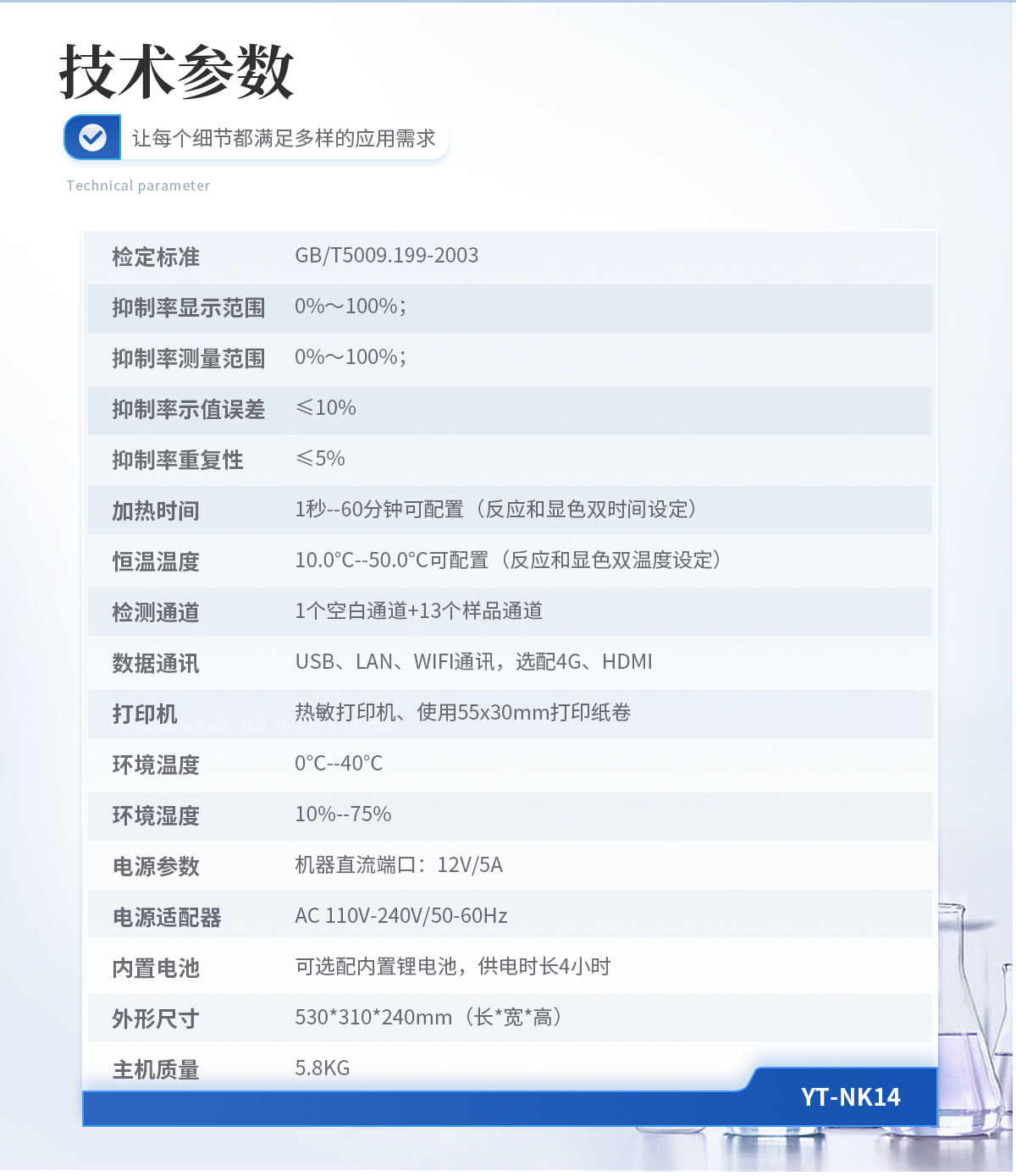檢定標(biāo)準(zhǔn):GB/T5009.199-2003 抑制率顯示范圍:0%~100%; 抑制率測(cè)量范圍:0%~100%; 抑制率示值誤差:≤10% 抑制率重復(fù)性:≤5% 加熱時(shí)間:1秒--60分鐘可配置(反應(yīng)和顯色雙時(shí)間設(shè)定) 恒溫溫度:10.0℃--50.0℃可配置(反應(yīng)和顯色雙溫度設(shè)定) 檢測(cè)通道:1個(gè)空白通道+13個(gè)樣品通道 數(shù)據(jù)通訊:USB、LAN、WIFI通訊,選配4G、HDMI 打印機(jī):熱敏打印機(jī)、使用55x30mm打印紙卷 環(huán)境溫度:0℃--40℃ 環(huán)境濕度:10%--75% 電源參數(shù):機(jī)器直流端口:12V/5A 電源適配器:AC 110V-240V/50-60Hz 內(nèi)置電池:可選配內(nèi)置鋰電池,供電時(shí)長(zhǎng)4小時(shí) 外形尺寸:530*310*240mm(長(zhǎng)*寬*高) 主機(jī)質(zhì)量:5.8KG