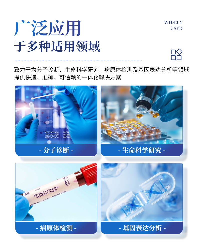 基礎(chǔ)科學(xué)研究、病原體檢測(cè)、肉制品摻假、轉(zhuǎn)基因檢測(cè)、食品安全檢測(cè)、藥物開(kāi)發(fā)及合理用藥、基因表達(dá)、水體監(jiān)測(cè)、松材線蟲(chóng)檢測(cè)、寵物檢測(cè)、養(yǎng)殖業(yè)疫病檢測(cè)