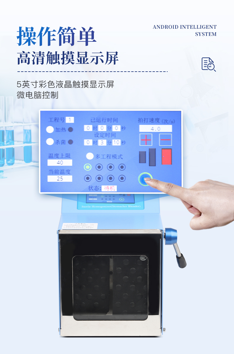 ●5英寸液晶顯示屏。 ●可儲(chǔ)存三組工作程序。 ●可調(diào)整的均質(zhì)時(shí)間。 ●均質(zhì)速度可調(diào)節(jié)或固定。 ●拍擊器可調(diào)整前后距離。 ●無(wú)菌一次性濾袋,保證衛(wèi)生。 ●全開(kāi)啟式門,易于清洗。 ●玻璃透明窗口易于觀察 。 ●樣品與均質(zhì)儀無(wú)接觸,如無(wú)樣品泄露則不需進(jìn)行系統(tǒng)清洗. ●均質(zhì)柔和、樣品零污染、無(wú)損傷、不升溫、不需要滅菌處理,不需洗刷器皿。