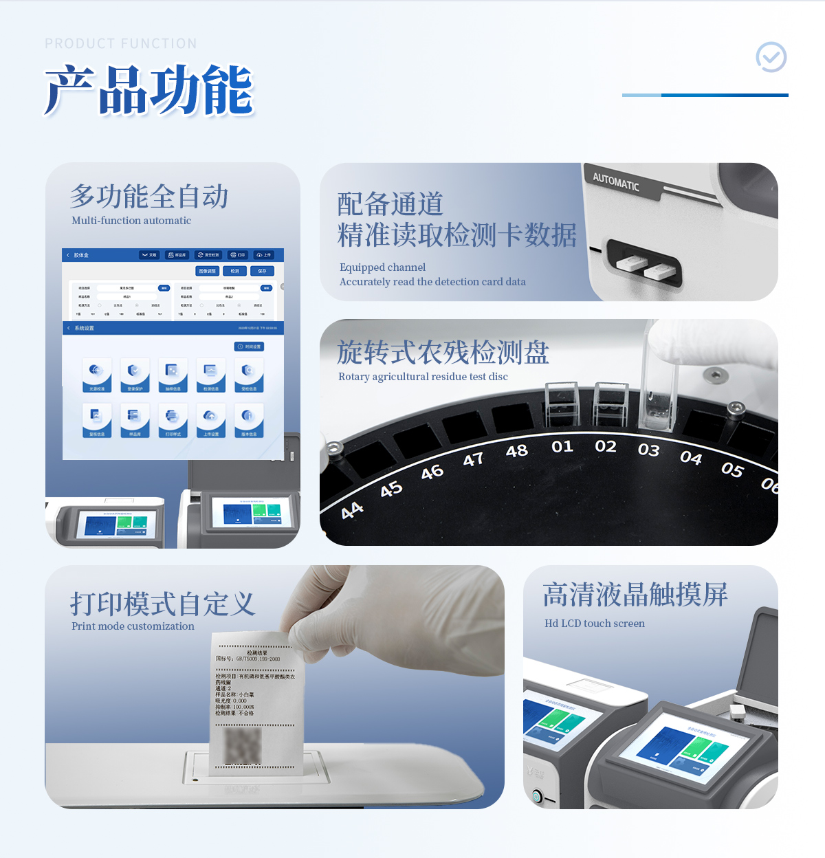 | 1. 試劑位置:3個 | 2. 農(nóng)殘檢測盤:旋轉(zhuǎn)24通道比色盤,可任意選擇檢測通道,自動對應(yīng)選擇通道。 | 3. 膠體金通道:2個,可讀取檢測卡結(jié)果,自動采集、處理分析,自動判斷檢測結(jié)果,并具備自動判空功能。 | 4.系統(tǒng)配置:10.1寸高清液晶觸摸屏,采用ARM Cortex?-A7,RK3288/4核處理器,運(yùn)行內(nèi)存1GB。Android7.1.1 系統(tǒng)分辨率1280×800。 | 5.恒溫系統(tǒng):具有自動加溫溫控系統(tǒng),精準(zhǔn)恒溫37℃,精度±0.1℃。 | 6.添加系統(tǒng):儀器按照試劑要求自動、按時、按量加入試劑,并且自動對未正常放置的樣本或異常的樣本進(jìn)行檢查并提示。 | 7.清洗功能:儀器具備回流及自動清洗管路功能,避免試劑污染。 | 8.混勻功能:設(shè)備具備自動混勻功能。 | 9.光源校準(zhǔn):設(shè)備可自動校準(zhǔn),確保檢測準(zhǔn)確度。 | 10.實(shí)時監(jiān)控:儀器測試過程中屏幕顯示運(yùn)行狀態(tài),可實(shí)時查看。 | 11.數(shù)據(jù)存儲:內(nèi)部存儲16GB,可存儲500萬條數(shù)據(jù)。 | 12.樣品多選功能:設(shè)備具備樣品一鍵多選功能,選擇樣品自動匹配檢測通道。 | 13.項目預(yù)設(shè):可提前設(shè)置單個及多個相同或不相同的檢測任務(wù),可單次或者多次調(diào)取,減少檢測時間。 | 14.自定義打印系統(tǒng):內(nèi)置自定義打印系統(tǒng),可按需靈活設(shè)置開啟或關(guān)閉:產(chǎn)品合格證(國家農(nóng)業(yè)部標(biāo)準(zhǔn)),二維碼,抽樣信息、檢測信息,受檢信息等信息的打印。 | 15.A4版本報告打印功能:設(shè)備可自動生成A4版報告,A4報告帶二維碼,可掃描二維碼生成電子版,并可識別真?zhèn)巍?/td> | 16.傳輸方式:儀器配備無線通信模塊: 4G(APN)通訊模塊、Wifi模塊,藍(lán)牙傳輸模塊,同時具有USB接口以及RJ45接口能以多種方式實(shí)現(xiàn)數(shù)據(jù)保存和數(shù)據(jù)傳輸功能,設(shè)備數(shù)據(jù)可以同步上傳至平臺。 | 17.系統(tǒng)17.數(shù)據(jù)監(jiān)管系統(tǒng):設(shè)備自帶監(jiān)管平臺,并可同步對接監(jiān)管平臺,數(shù)據(jù)可局域網(wǎng)和互聯(lián)網(wǎng)數(shù)據(jù)上傳,檢測結(jié)果可直接傳至食品安全監(jiān)管平臺。達(dá)到食品安全問題預(yù)估、預(yù)警。 | 18.系統(tǒng)遠(yuǎn)程更新功能:無需設(shè)備返廠,即可遠(yuǎn)程實(shí)時升級全新系統(tǒng),節(jié)省時間成本及避免運(yùn)輸造成設(shè)備損。 |