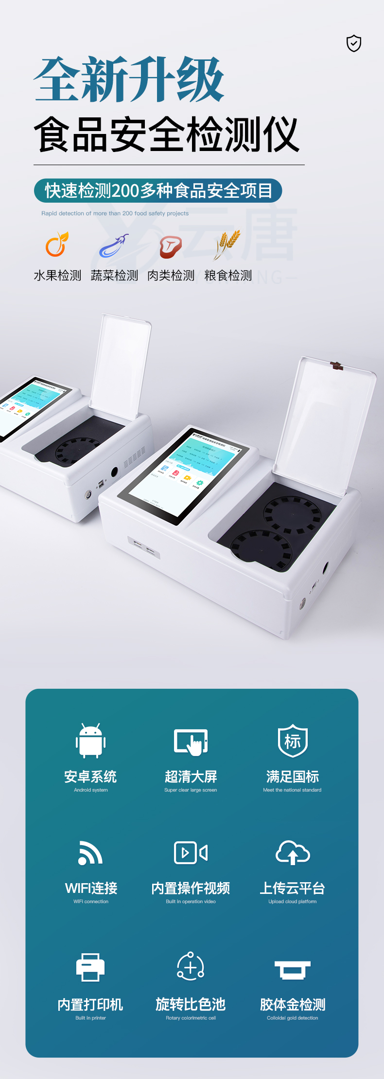 1、儀器采用臺式一體化系統(tǒng)檢測技術(shù),將分光光度模塊、膠體金檢測模塊、新型農(nóng)殘檢測模塊、數(shù)字化管理模塊、無線通訊模塊高度集成于一體,支持檢測200種食品安全檢測項目,同時預(yù)留升級檢測方法。