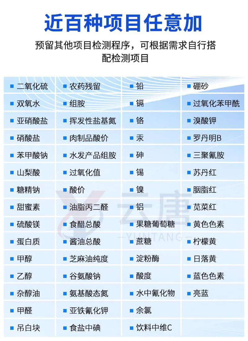 可快速檢測各類食品中的甲醛、二氧化硫、亞硝酸鹽的含量,儀器預留其他項目檢測程序和端口,根據(jù)日后需求可方便的自主增加檢測項目。