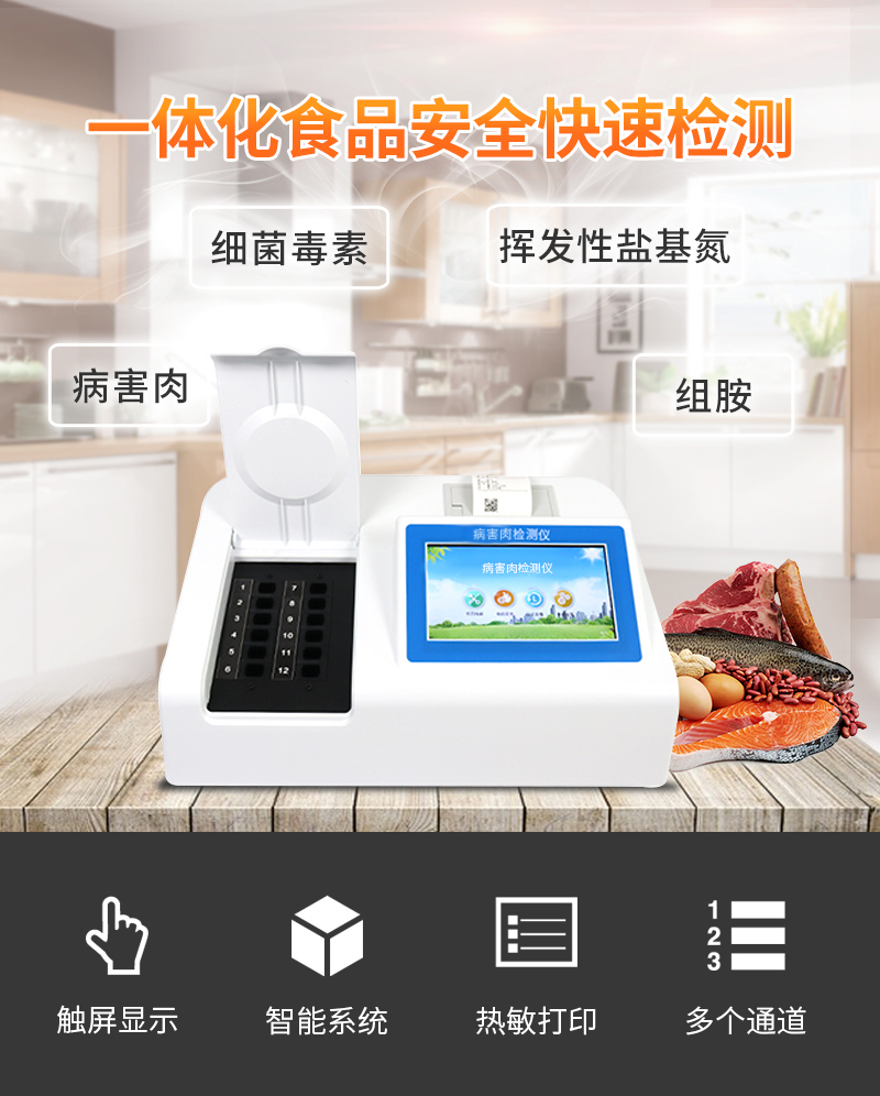 該多功能食品安全檢測儀為集成一體化食品安全快速檢測分析設備,廣泛應用于市場監(jiān)管局、食品肉產品深加工企業(yè)、衛(wèi)生部門、學校食堂、農業(yè)部門、養(yǎng)殖場、屠宰場、檢驗檢疫部門等單位使用。