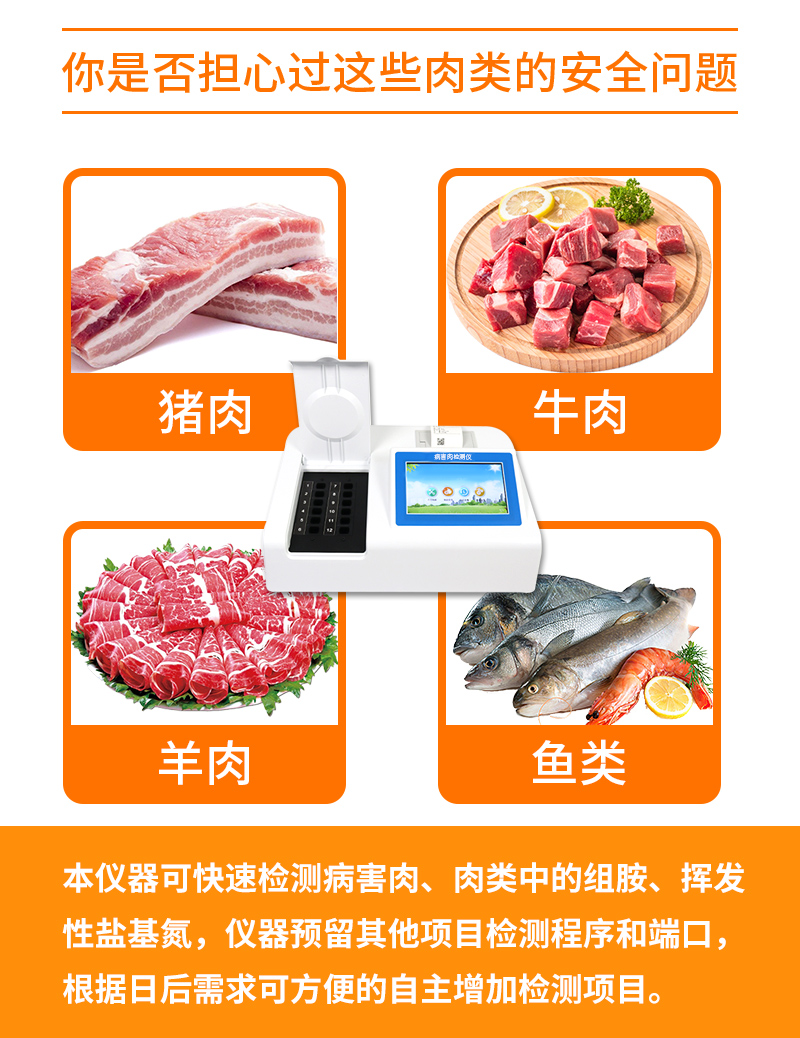 可快速檢測病害肉、組胺、揮發(fā)性鹽基氮,儀器預留其他項目檢測程序和端口,根據日后需求可方便的自主增加檢測項目。