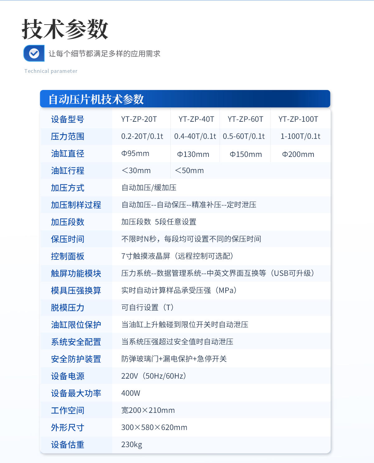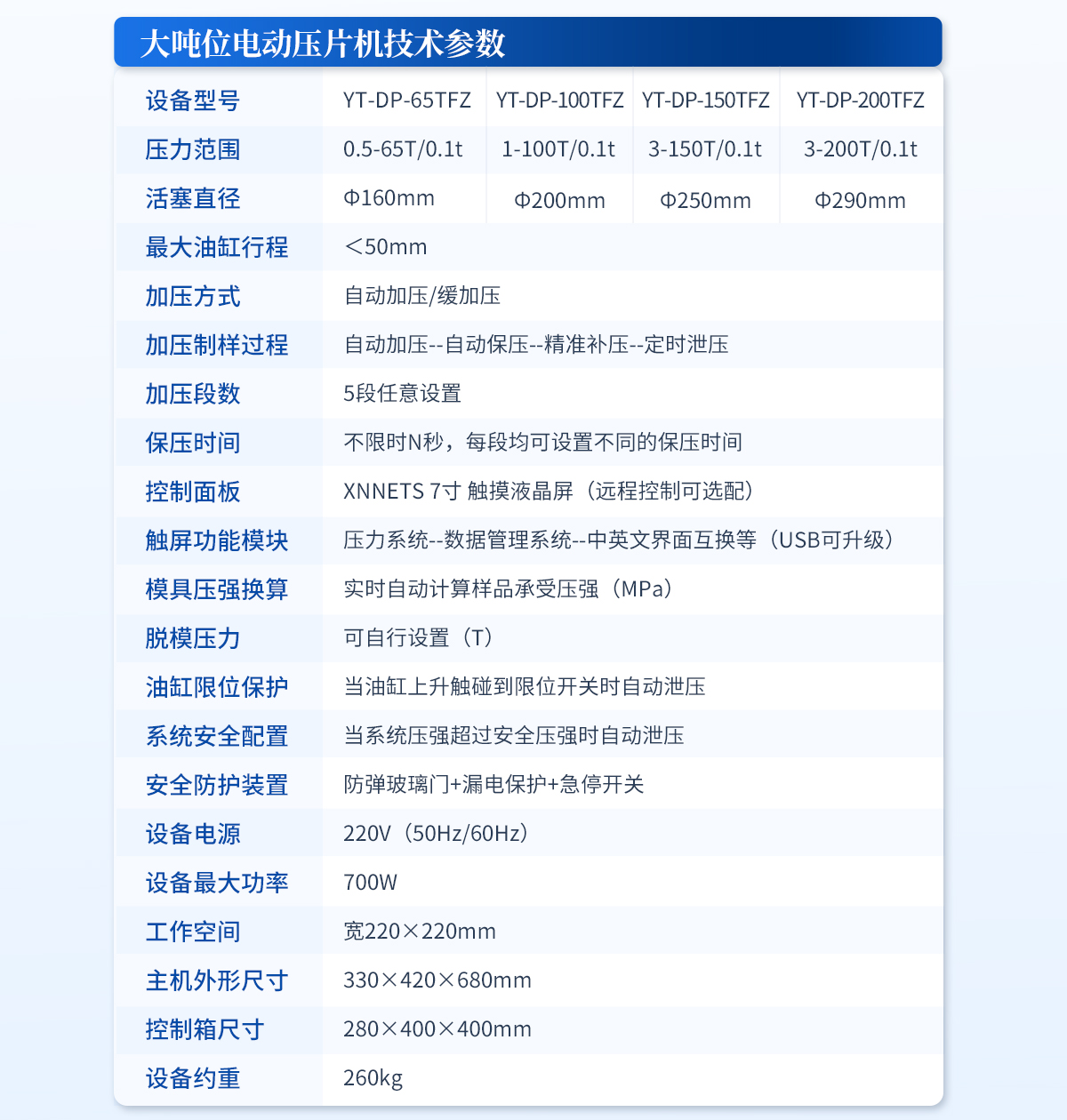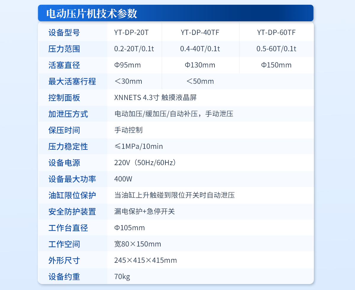 | 設(shè)備型號(hào):YT-ZP-60T | 壓力范圍:0.5-60T/0.1t | 油缸直徑:Ф150mm | 油缸行程 :<50mm | 加壓方式:自動(dòng)加壓/緩加壓 | 加壓制樣過(guò)程:自動(dòng)加壓--自動(dòng)保壓--精準(zhǔn)補(bǔ)壓--定時(shí)泄壓 | 加壓段數(shù):5段任意設(shè)置 | 保壓時(shí)間:不限時(shí)N秒,每段均可設(shè)置不同的保壓時(shí)間 | 控制面板:XNNETS 7寸 觸摸液晶屏(遠(yuǎn)程控制可選配) | 觸屏功能模塊:壓力系統(tǒng)--數(shù)據(jù)管理系統(tǒng)--中英文界面互換等(USB可升級(jí)) | 模具壓強(qiáng)換算:實(shí)時(shí)自動(dòng)計(jì)算樣品承受壓強(qiáng)(MPa) | 脫模壓力:可自行設(shè)置(T) | 油缸限位保護(hù):當(dāng)油缸上升觸碰到限位開(kāi)關(guān)時(shí)自動(dòng)泄壓 | 系統(tǒng)安全配置:當(dāng)系統(tǒng)壓強(qiáng)超過(guò)安全值時(shí)自動(dòng)泄壓 | 安全防護(hù)裝置:防彈玻璃門(mén)+漏電保護(hù)+急停開(kāi)關(guān) | 設(shè)備電源:220V(50Hz/60Hz) | 設(shè)備**功率:400W | 工作空間:寬190×180mm | 外形尺寸 :300×520×580mm | 設(shè)備估重 :165kg | 配置說(shuō)明:壓片機(jī)1臺(tái),模具選配!可根據(jù)需求定制壓片機(jī)或模具 |