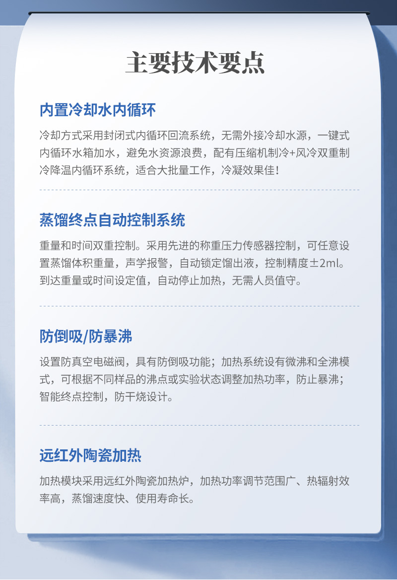 5、蒸餾終點控制:自動偵測蒸餾終點功能,采用稱重和時間雙重控制,蒸餾體積控制在±2ml之內(nèi),自動化程度高;